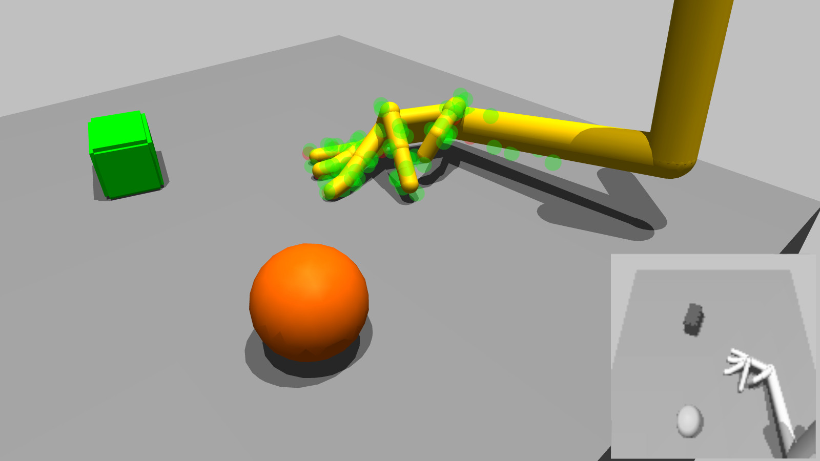 Below you can see the humanoid arm with added visualizations for its 32x32 vision and binary touch sensor array. This environment could be used for a variety of tasks (i.e. reinforcement signals), but generally I wanted to focus on curiosity here, i.e. emergent, self-directed tasks in an open-ended, playground-like environment.