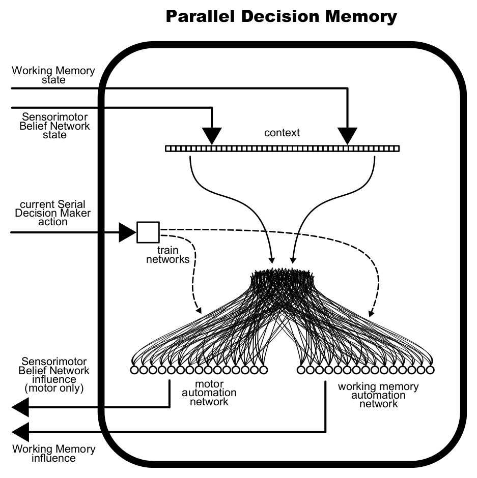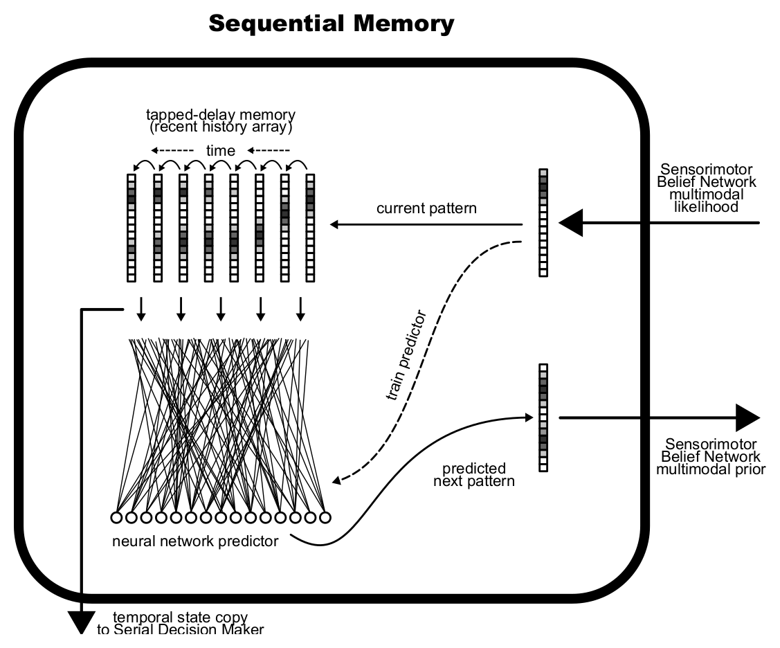 I eventually decided to focus on six brain regions, each represented by a separate component: sensory cortex, motor cortex, prefrontal cortex, hippocampus, basal ganglia, and cerebellum. (Note: later I began treating sensory and motor cortex as a single region, resulting in the final 5-component architecture.) These are described in the first poster below. The second poster goes into more detail about the sensory/motor cortex model.