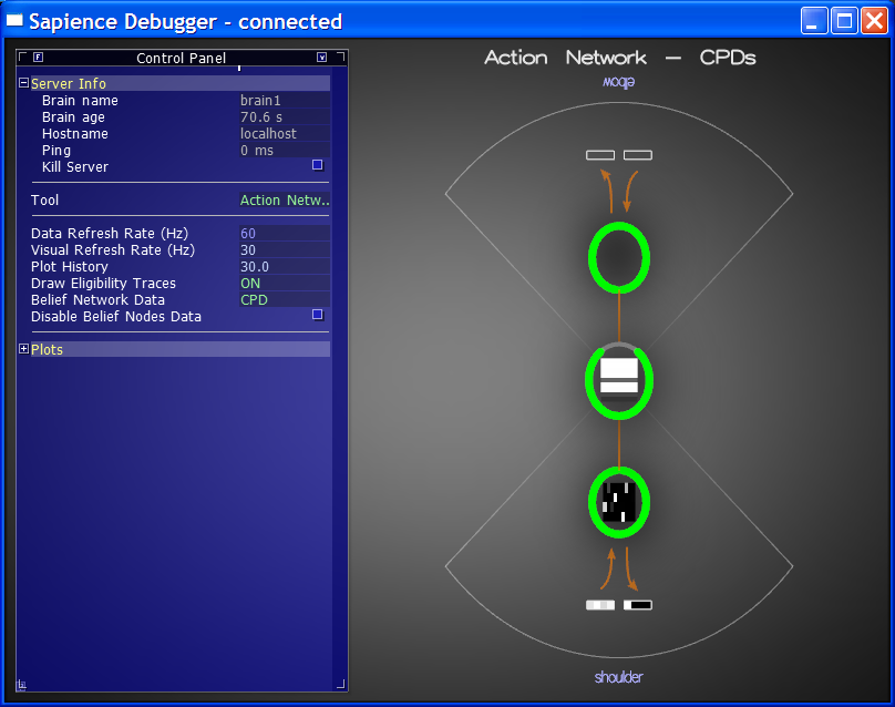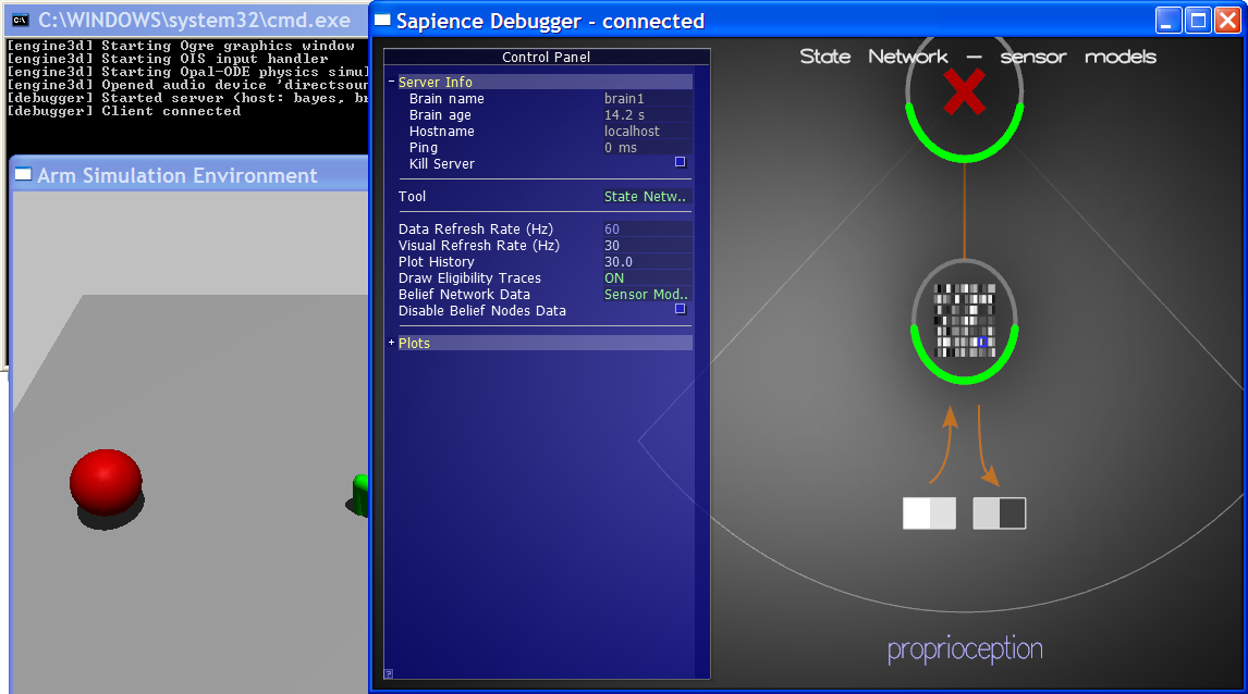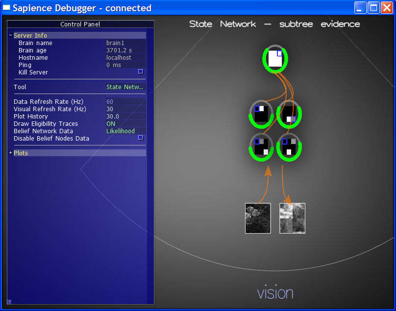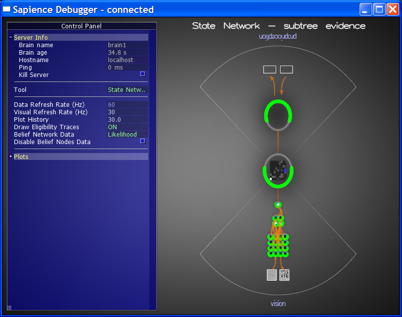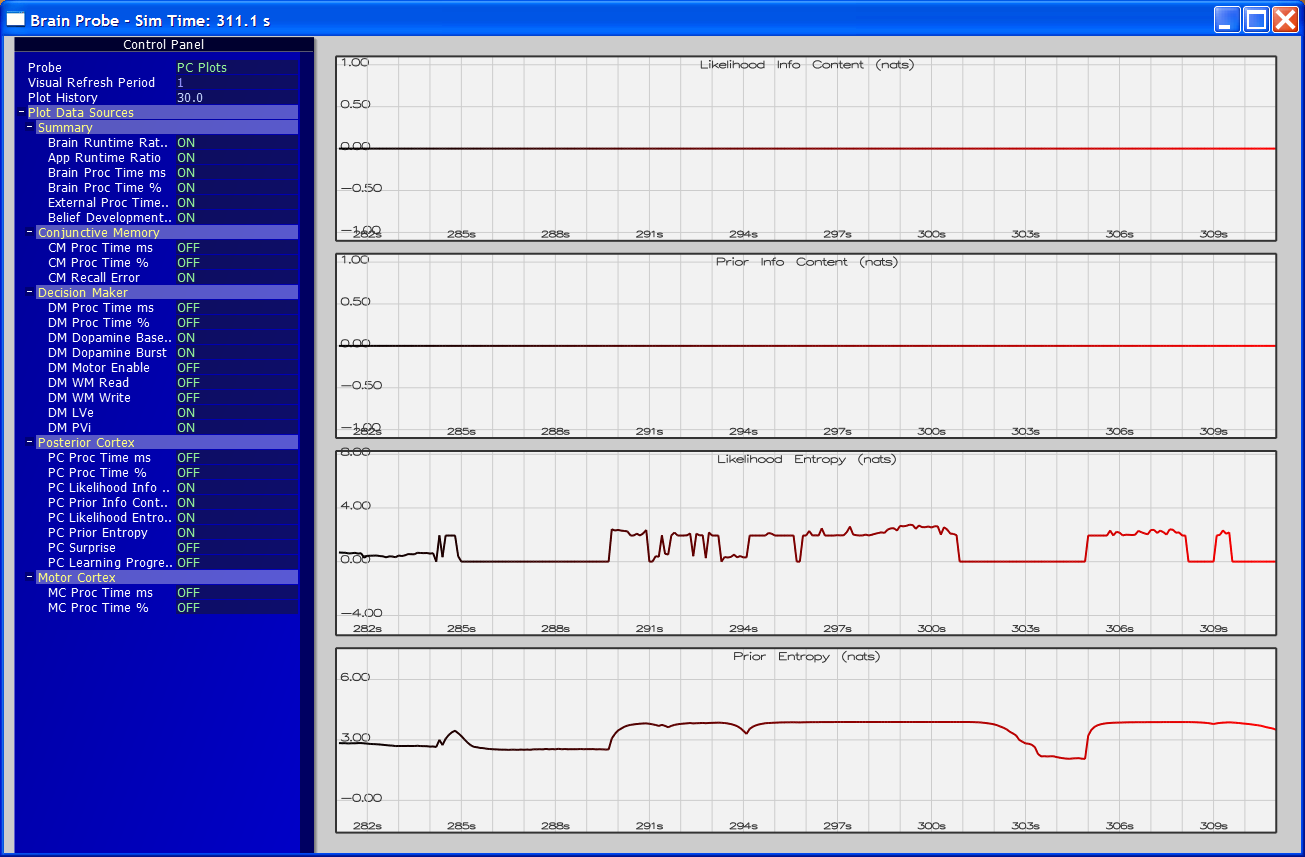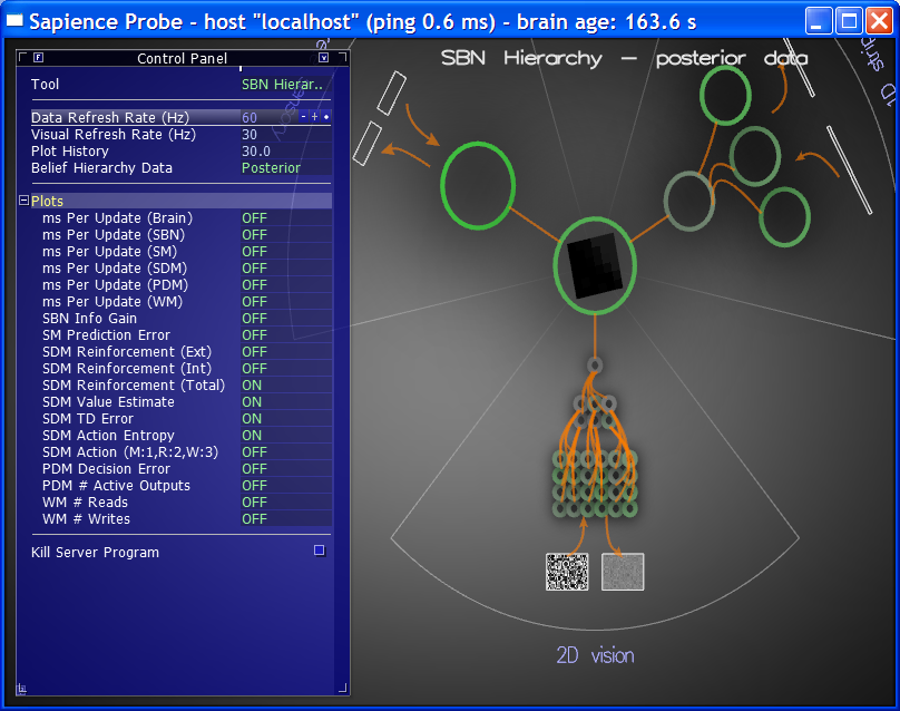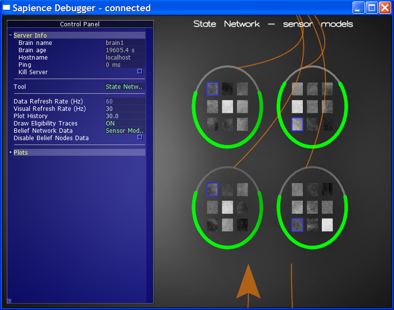 To inspect various internal aspects of a Sapience Brain in real time, I also implemented a tool that I called the Sapience Probe (also called the Debugger in some of the screenshots below). The Probe could take a reference to any active Brain and query all kinds of things: current raw input/output data, current internal activation states, various key one-dimensional quantities (like reinforcement/value signals), performance profiling info, etc.
