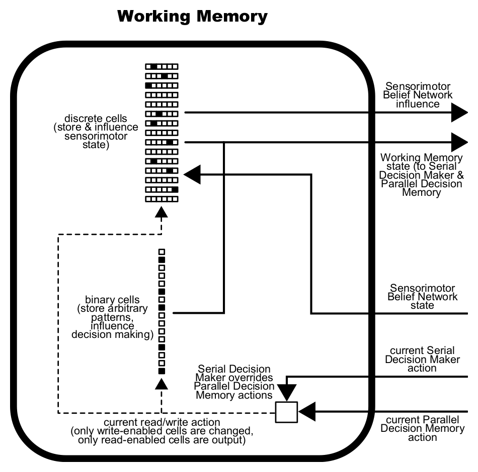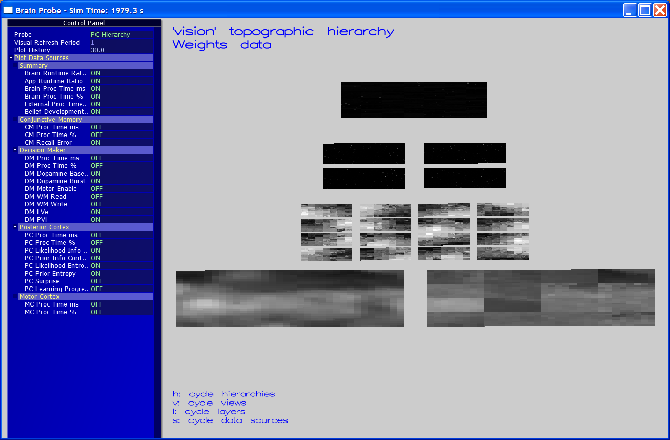 Not shown here are visualizations of other components. For example, the contents of the memory cells in the Working Memory component could be displayed as an array. Overall, it was possible to jump between each component to see how it was learning/responding to the current situation. It really did feel like using a debugger (in an IDE), but for a simulated brain instead of a normal program.