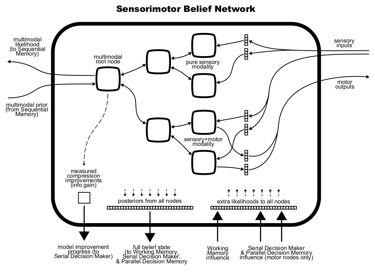 Note: the motor outputs are described here as binary, i.e. applying either zero or some fixed torque at a joint. The document linked here also mentions using "force-limited velocity constraints" (FLVCs), which would use two real values per joint (one to set a desired velocity, and another to set a maximum force output). My original plan was to use FLVCs, but I later switched to binary motors. I made this change because I wanted to keep the raw input/output data as simple as possible (i.e. not requiring a separate control system, even a very simple one like FLVCs). I generally wanted the system to learn any useful transformations directly from the data without any extra help. So, if a FLVC or PID is actually helpful, it would need to construct its own form of these mechanisms internally.