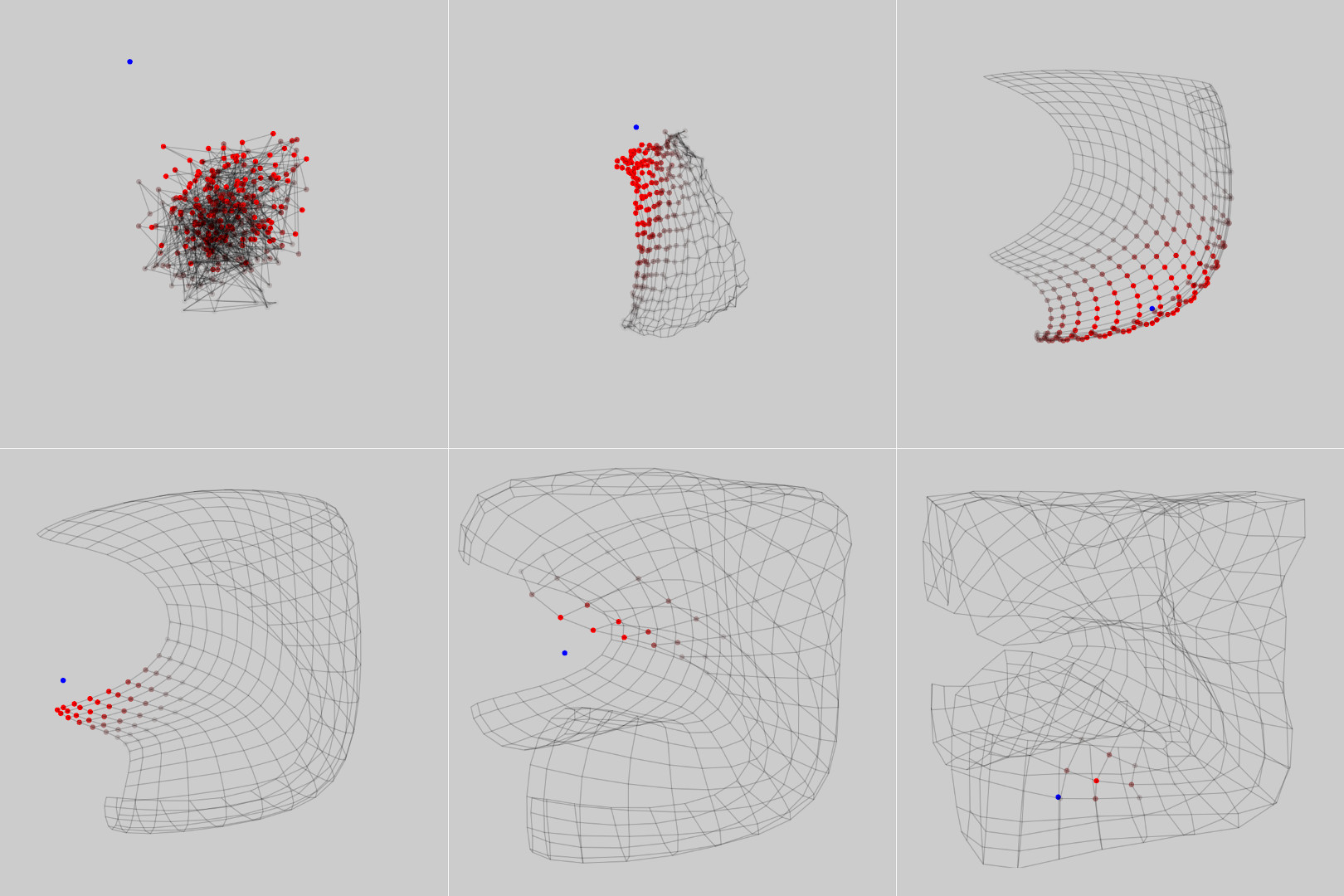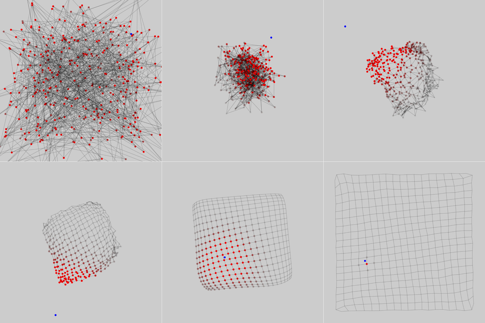 To learn more about them, I implemented Kohonen's basic SOM algorithm. I wanted to gain some intuition concerning how they adapt over time, so I set up a 3D visualization which shows the map moving through the input space as data is acquired (in an incremental learning mode, not batch). Below are some results from training a map on a uniform sampling of both a 2D square and a 3D cube. The blue dot is the sample input point. The translucent red dots represent the winning node's neighborhood, which diminishes over time. Notice how in each case the maps try to fill the input space as well as possible (but note that Kohonen's original SOM does not achieve optimal spacing, i.e. the density of the SOM neuron centers does not match the probability density of the data distribution).