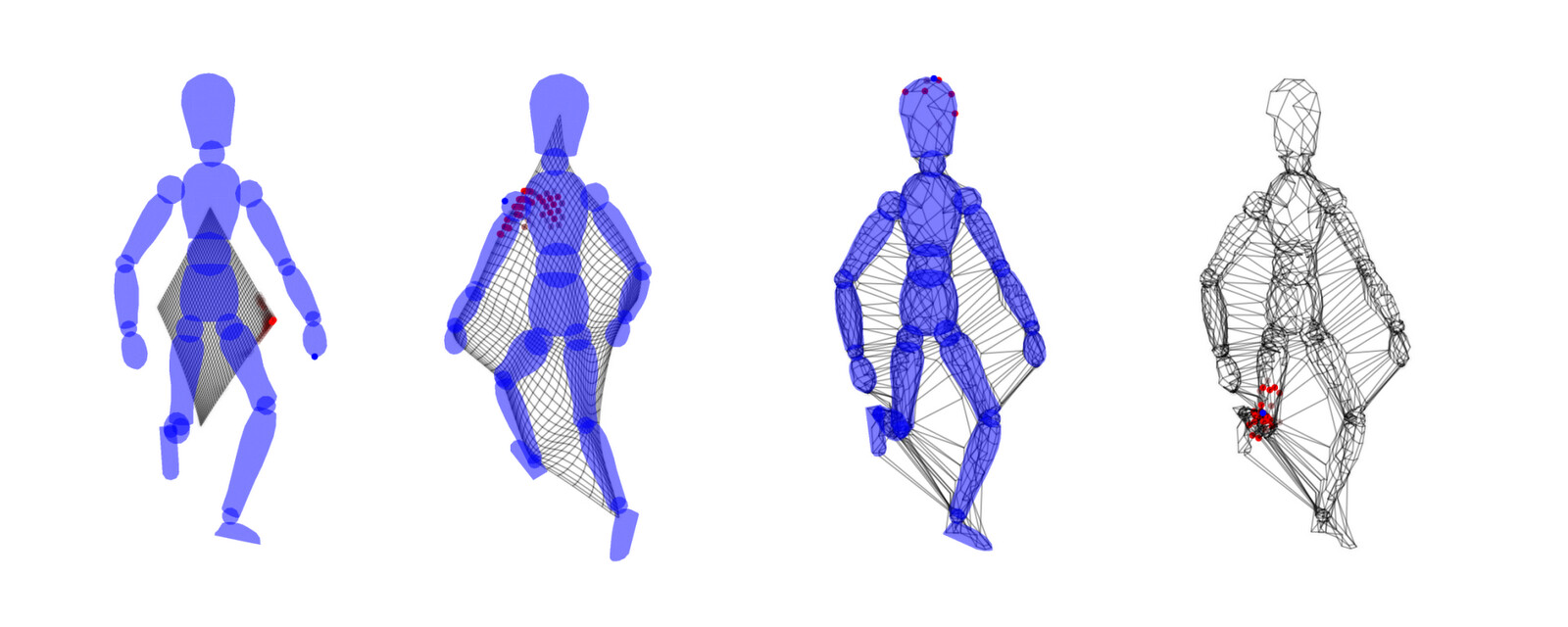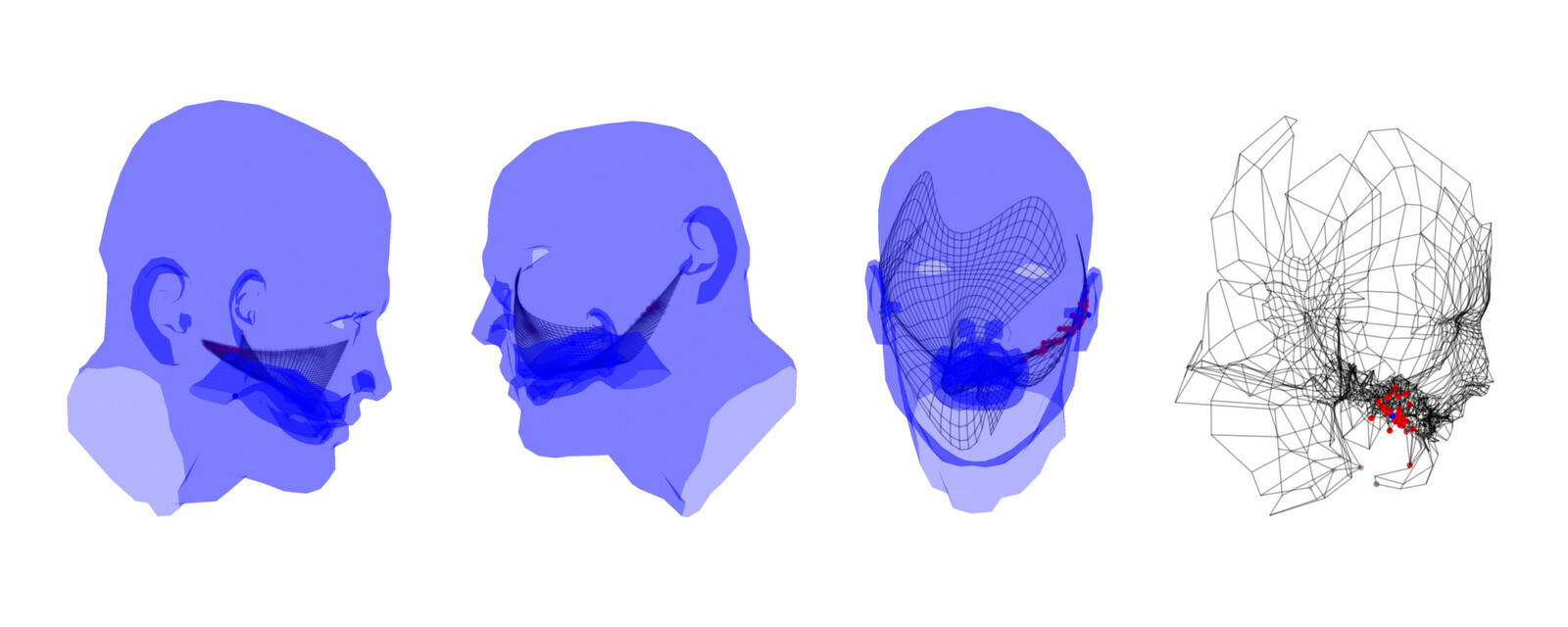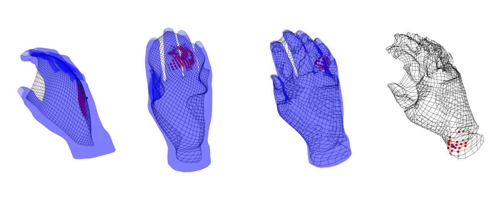 The images below show my topographic map learning to cover several "body" surfaces, including a simple torso, a hand, a human head, a human body, a wooden doll, and a sword. The maps start out as flat 2D sheets and learns to wrap around the body. Where does the training data come from? I simulate random data points from the body surface... sort of like having someone constantly poke it in different places. The topographic map responds to these data points by moving part of itself closer to them. One cool thing about my method is that it automatically learns to represent the most-touched regions with higher fidelity; it's like how our brains use more real estate to represent our hands and faces. (In these examples, I'm sampling the vertices of 3D models, which results in higher map density in places with high vertex density. For example, the human head model has a lot of vertices in the mouth cavity, so it becomes well-represented in the topographic map.)