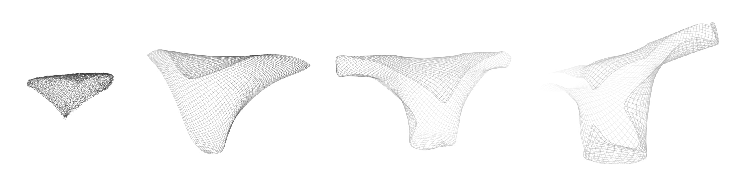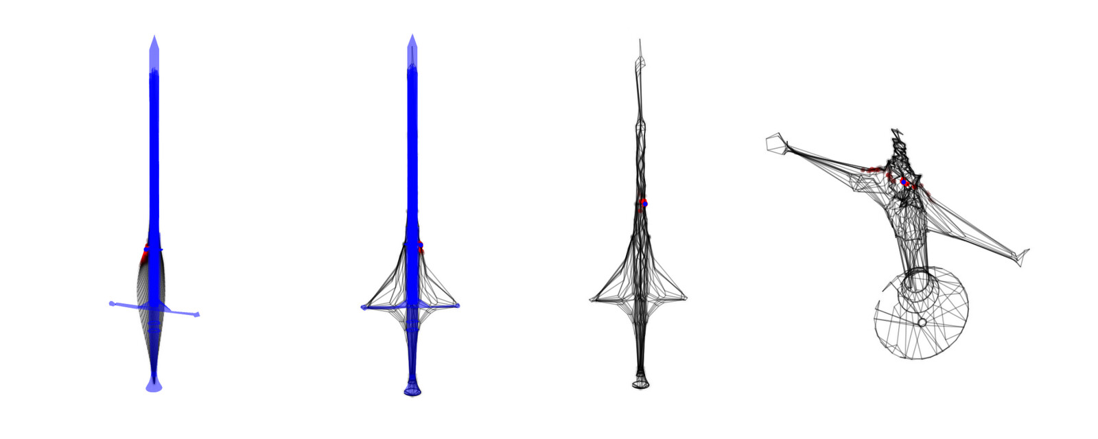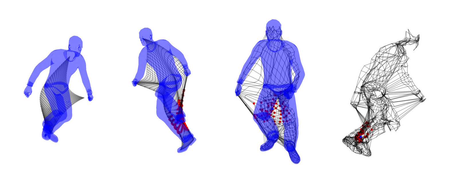 The images below show my topographic map learning to cover several "body" surfaces, including a simple torso, a hand, a human head, a human body, a wooden doll, and a sword. The maps start out as flat 2D sheets and learns to wrap around the body. Where does the training data come from? I simulate random data points from the body surface... sort of like having someone constantly poke it in different places. The topographic map responds to these data points by moving part of itself closer to them. One cool thing about my method is that it automatically learns to represent the most-touched regions with higher fidelity; it's like how our brains use more real estate to represent our hands and faces. (In these examples, I'm sampling the vertices of 3D models, which results in higher map density in places with high vertex density. For example, the human head model has a lot of vertices in the mouth cavity, so it becomes well-represented in the topographic map.)