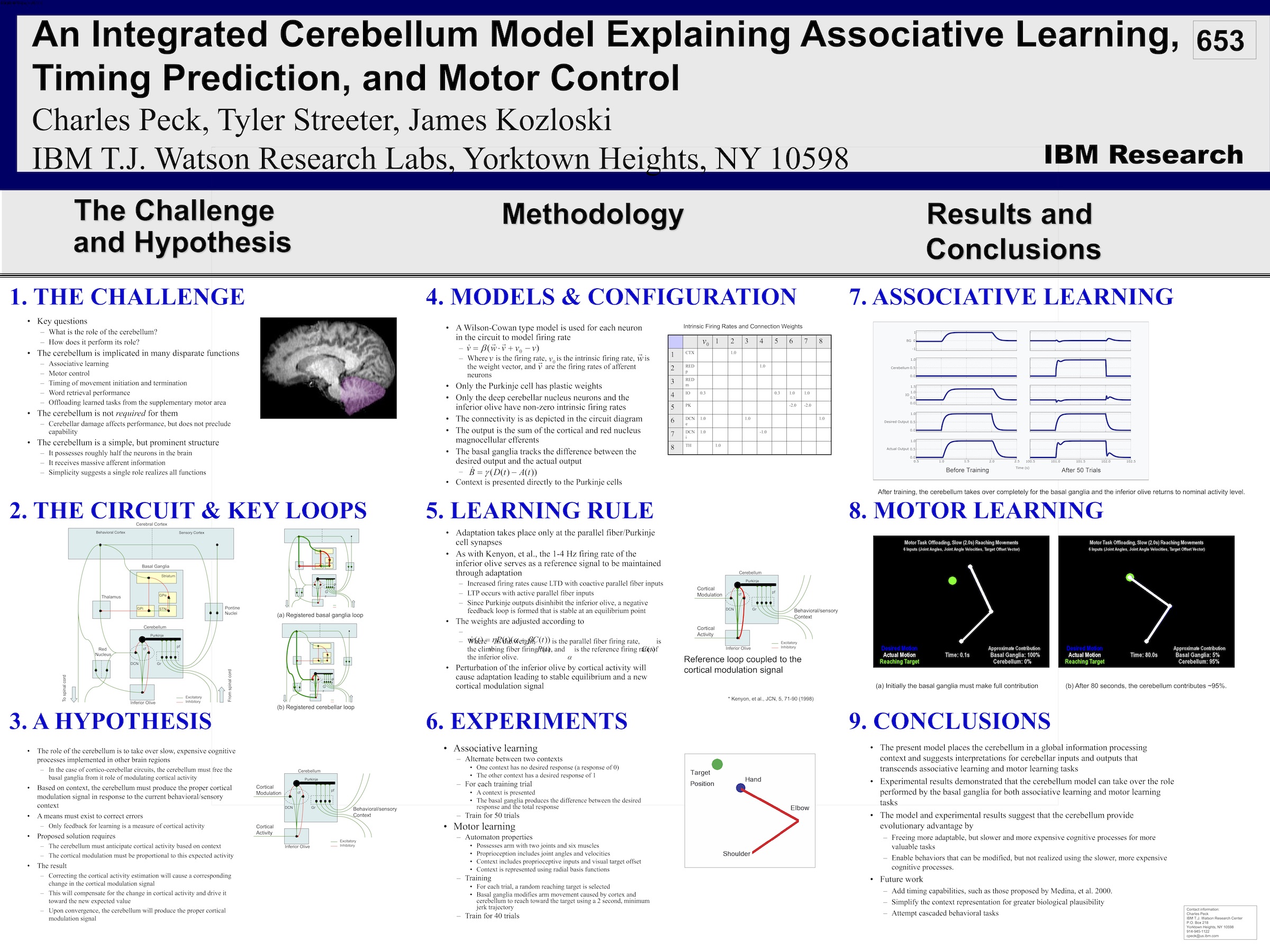 Peck, Streeter, & Kozloski. 2007. An Integrated Cerebro-Cerebellar Model Demonstrating Associative Learning and Motor Control. 10th Tamagawa-Riken Dynamic Brain Forum. [pdf, link]